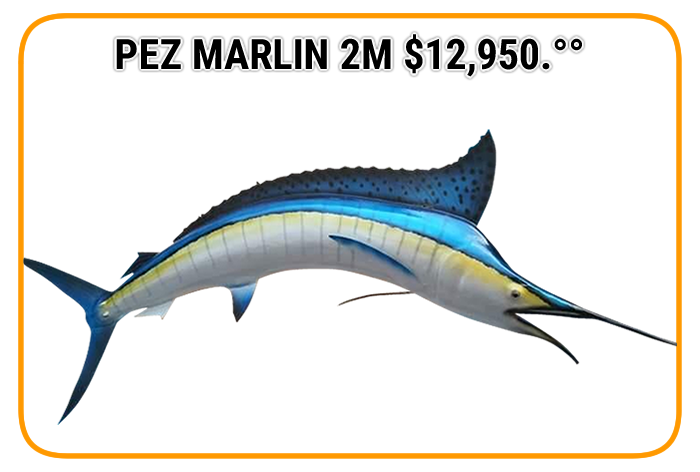 Réplicas de especies reales de nuestra Región: Marlín, Pez Vela, Dorado, Tiburón, Pez Globo, Pez Martillo, Estrellas, Caracoles, Almejas, Ostras, Mandíbulas y variadas Artesanías de Mar.
